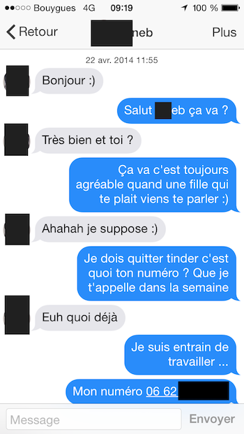 Je vous l’ai déjà dit : sur Tinder, tout va vite. On swipe à la seconde, et voit plein de photos (et de possibilité de rencontre) défiler sur son portable, et on n’est clairement pas là pour s’envoyer des lettres d’amour. Un premier message Tinder efficace est toujours court (pas plus de deux phrases, vous aurez tout le temps d’approfondir par la suite).