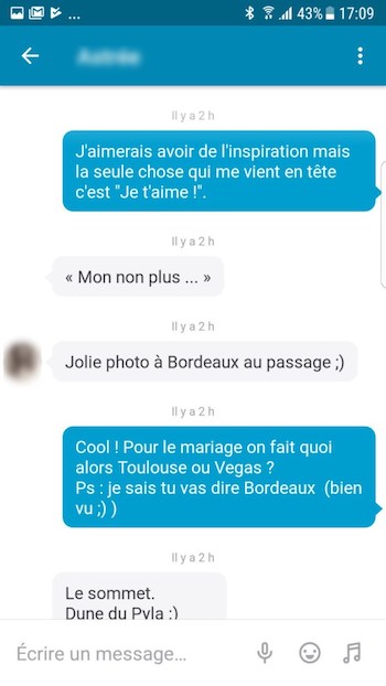 - La franchise : allez droit au but. C’est encore le meilleur moyen de ne pas perdre de temps en annonçant clairement la couleur (sans être trop cru non plus). Vous pouvez lui dire « Salut XX, à part une photo de toi, je ne sais rien de toi, mais j’ai vraiment envie de faire ta connaissance. Ca te tente d’aller prendre un verre ? »