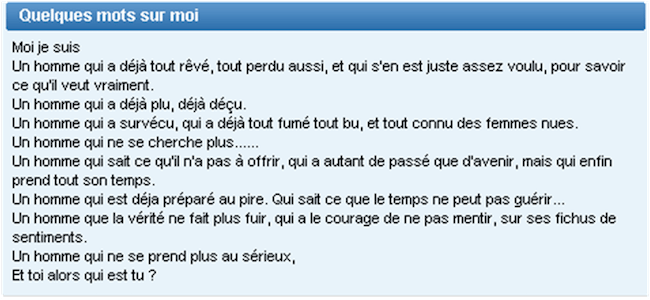 N’en faites pas trop non plus et n’écrivez pas une mini biographie à rallonge. Essayez de garder un peu le mystère, et révélez-vous par petites touches, en laissant aux femmes le loisir d’apprendre à plus vous connaître par la suite.